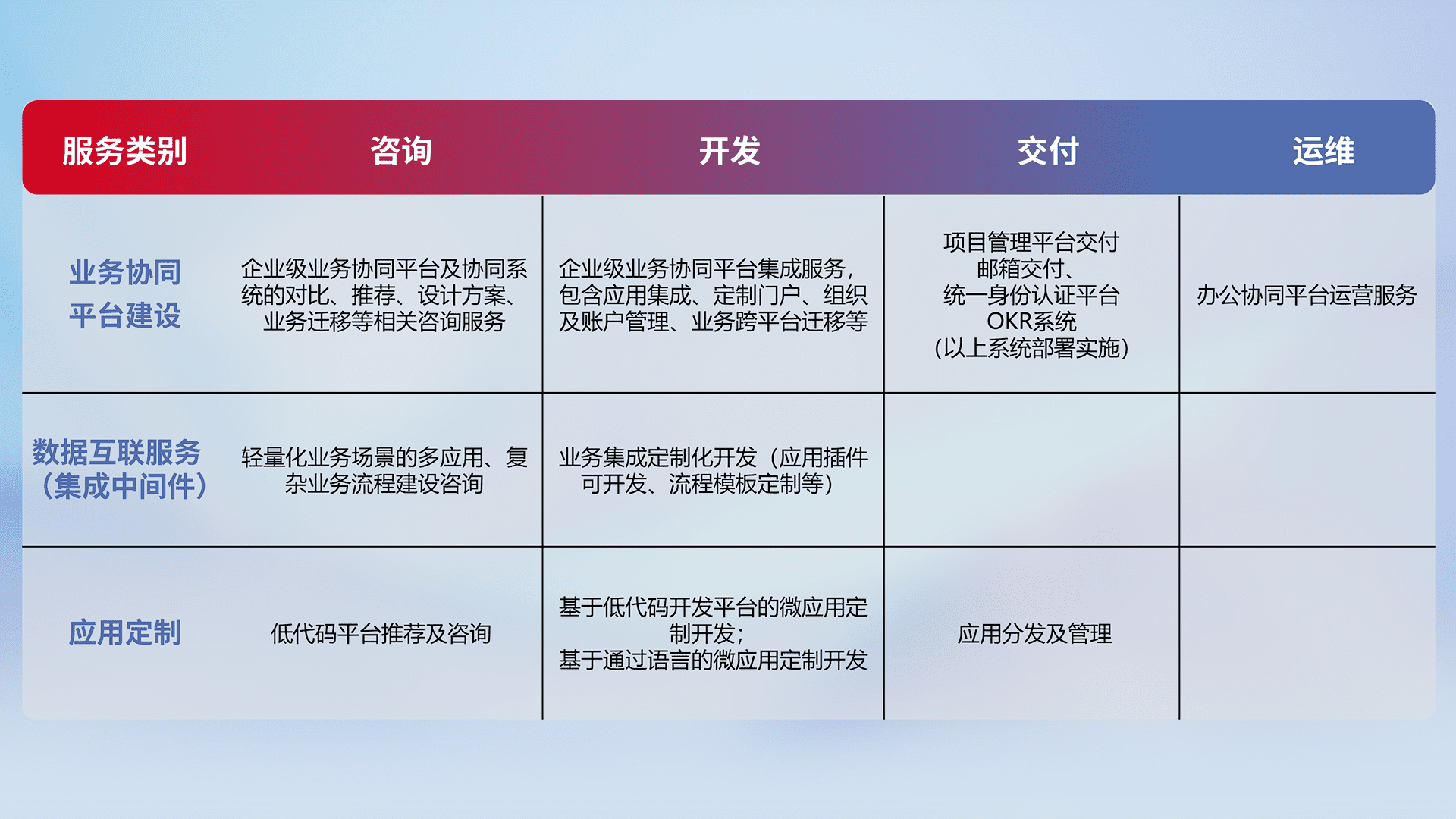 针对钉钉、、、企微、、、、IDaas等平台级产品提供产品的规划、、方案、、、、交付、、定制化开发等服务,,实现如统一协同办公、、、智能客户服务、、、混合会议管理、、、智能数据查询、、、、等业务场景,,实现数字化转型。。。。